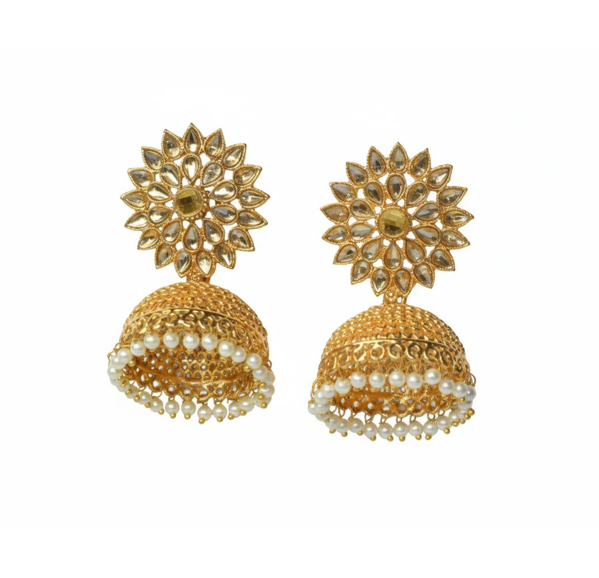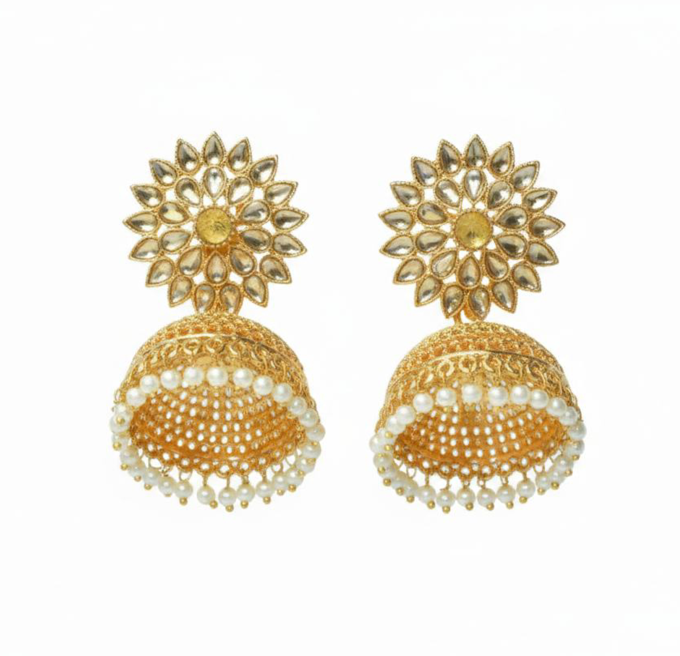 Beautiful Kundan pearl jhumka earrings featuring intricate detailing and a classic bell-shaped design.,Elegant and versatile, perfect for festive occasions and traditional ensembles.